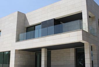 Esta vivienda sigue un perfil cúbico vanguardista con acabados en piedra natural y vidrio. Un volumen robusto y sobrio tanto como por su diseño como por los materiales utilizados y acabado.