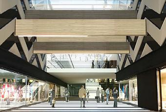 En el interior, la plaza central comunica los dos niveles donde encontramos un conjunto escultórico colgante realizado en paneles de madera artificial, que sirve al mismo tiempo como puntos de luz.