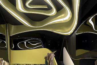 Los percheros comparten el concepto escultórico de la lámpara, convirtiéndose en piezas de diseño que se elevan desde el suelo, formando líneas sinuosas y marcadas curvas. Finalmente, los muros cuentan con un acabado espejado para dar mayor sensación de amplitud al espacio.