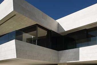 Destaca arquitectónicamente el gran volumen volado sobre el porche que acoge el dormitorio principal de la planta alta. Toda la vivienda está “vestida” en piedra de mármol travertino romano transventilado.