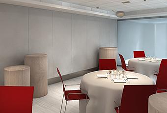 Para esta segunda propuesta se ha optado por un finalizado blanco y gris. Se han mantenido las sillas en color rojo para romper la monocromía del espacio. El techo en esta ocasión se ha decidido por un terminado en blanco, y el suelo se ha mantenido como en la propuesta anterior.