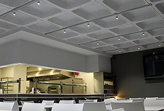 Se ha optado por mantener vista la estructura del techado para mantener la sensación antes comentada, al igual que mantener conductos de ventilación visibles, convirtiéndose en un elemento característico del interior.