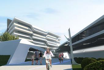 Se plantea una entrada escultural a este complejo formada por dos pérgolas cruzadas, que nos adelantan la línea de diseño que observaremos en las fachadas de los edificios en el interior.
