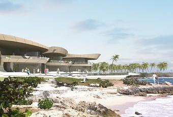 Esta propuesta contempla un exclusivo complejo hotelero formado por un total de 32 edificios independientes: 2 edificios de recogida y administración, y 24 bungalows dependientes a 6 edificios de zonas comunes donde ubicamos nuevas suites este. También podemos observar los diferentes elementos de agua como las piscinas exteriores y las láminas, que cobran gran importancia en este proyecto, convirtiéndose en un puente de unión entre la arquitectura y el mar. La playa es un elemento artificial donde se incorpora un pantalán.
