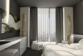 El estudio mustra dos propuestas en diferentes tonos. Una primera inspirada en tonos claros, en el que se ubican diferentes puntos de luz indirecta y perimetral, que resaltan los colores de los cuadros de la artista Mercedes Rodriguez. Para contrastar la estancia, tanto la pared como el suelo tiene acabados oscuros, por lo que se ha elegido tanto el mobiliario como la ropa de cama en colores blancos. A modo de cabecero se ha ubicado un cuadro de la artista anteriormente citada, transmitiendo vida y luminosidad a la habitación. Tanto el taburete, como la mesa auxiliar y silla pertenecen a la colección SEN de A-cero IN.