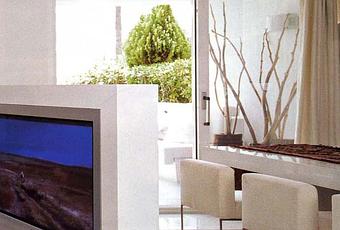 Todo el mobiliario: mesas, librerías, sofás, sillas, etc…está diseñado como parte integrante del apartamento. Los materiales utilizados para el interior se combinan entre tonos fríos y cálidos; como el pavimento de mármol macael y el revestimiento de madera. Suelo, paredes y techos, acabados en blanco resaltan los acabados en tonos cálidos.