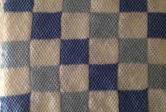 Hola chicas, buenos días. Hoy, a pesar del calor, os traigo una mantita para bebé, de lana, a cuadritos, inspirada en esta de Irene-Evelyn, pero en tonos más masculinos. Blanco, celeste y azulón. Aquí la podéis ver extendida, ha quedado preciosa ¿verdad?. Buen Martes.
