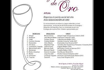 Con la posibilidad de degustar vinos premiados en concursos internacionales, en este año son 13. Conocer en persona a los Enólogos protagonistas de esos vinos.Se sorteará con la entrada una botella de cada vino degustado.Termina con una cena de camaradería para que todos los presentes compartan ese momento especial.Es el homenaje bien merecido que tienen los hacedores que buscan la calidad y la excelencia, y como Asociación le debemos ese reconocimiento.La actividad Social, Cultural y de Homenaje que organiza APEAA, invita a estar presentes a: Enólogos de todo el país, proveedores, Medios de Comunicación, Autoridades del medio y público amante del vino.Los vinos que se presentarán la noche de gala son 13 y con ellos podremos recorrer el territorio vitivinícola argentino y sus creadores:1- ANTIGAL Single Vineyard Las Dolores 2008 (Lic. Miriam Gómez)2- BUDEGUER, Patrimonio Cabernet 2009 (Lic. Juan Manuel Mallea)3- CALLIA Reserve Malbec 2011 (Lic. Gustavo Daroni)4- CARMINE GRANATA Semillón Cosecha Tardía 2007 (Lic. Esteban Roldán)5- DIAMANDES Gran Reserva 2007 (Lic. Silvio Alberto)6- EL ESTECO Torrontés Don David Finca Primavera 3 Cosechas 2012 (Lic. Alejandro Pepa)7- LEONARDO PUPPATO Malbec 2009 (Lic. Gabriel Funes)8- MERCED DEL ESTERO Mil vientos Criado en Barricas 2011 (Lic. Marcelo Onofri)9- MONTEVIEJO Lindaflor Malbec 2008 (Lic. Marcelo Pelleriti)10- NIETO Y SENETINER Don Nicanor Blend 2011 (Lic. Roberto González)11- NORTON Perdriel Vineyard Selection 2007 (Lic. Jorge Riccitelli)12- FAMILIA SCHROEDER Deseado Espumante Dulce Natural 2012 (Lic. Leonardo Puppatto)13- TRAPICHE Iscay Sirah Viognier 2010 (Lic. Daniel Pi)Recordamos entonces que la XVIII Degustación de Oro se realiza el próximo 9 de agosto a las 21 hs en Finca Don Miguel –Acceso Sur y Araoz - Luján de Cuyo, Mendoza[email protected] +54 261 5578977 Fuente: Claudia Corin para Se vino la tarde en Radio Andina