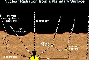 Los instrumentos del Espectrómetro de Rayos Gamma detectaron neutrones que se dispersan cuando los rayos cósmicos golpean la superficie marciana. Midiendo estos neutrones es posible calcular la abundancia de hidrógeno en Marte, y de esta forma inferir la presencia de agua. (Crédito de la imagen: NASA)Basándose en los datos del GRS, los investigadores pudieron crear mapas de neutrones en la superficie marciana indicando la ubicación de los suelos ricos en hidrógeno, y probablemente en agua. Desde de unos 55° de latitud norte y sur, el suelo contiene una masa de alrededor de un 50% de agua. Esto significa que 1 kg de suelo en estas regiones contendría alrededor de medio kilogramo de agua.