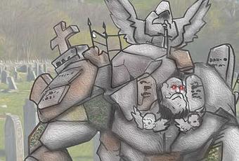 "Una criatura misteriosa se ha mudado al cementerio de la ciudad y asesina a cualquiera que se atreva a entrar en sus nuevos terrenos de caza. Los informes de testigos presenciales dicen que el monstruo parece una especie de golem, pero hecho con lápidas y otros elementos funerarios cubiertos de musgo. Los PsJ han sido contratados para eliminar esta amenaza, o tal vez simplemente se han topado con esta criatura accidentalmente.mientras se daban una vuelta por el cementerio, ocupándose de sus propios asuntos".