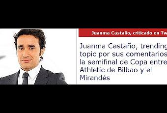Un comentario desafortunado de algún personaje conocido tiene muchas posibilidades de convertirse entrending topic en twitter. Esto es lo que le ha pasado al comentarista deportivo de Telecinco y de la Cope, Juanma Castaño, que tras la finalización de la semifinal de la Copa del Rey que enfrentaba al Athletic de Bilbao y al Mirandés, que ganó por 6-2 el equipo vasco, entrevistaba al héroe del equipo burgalés, Pablo Infante al que le decía "¡Vaya fiesta! ¿No?. Un comentario al que el jugador responde "Fiesta es para ellos".A raíz de ese comentario la red social empezó a echar humo y los comentarios no dejaron de sucederse hasta convertir a Juanma Castaño en trending topic. Desde los políticos "Juanma Castaño a Carme Chacón después del congreso del PSOE "Vaya fiesta, ¿eh?" (@elbaronrojo) a los cinematográficos"Juanma Castaño a Bambi tras morir su madre. ¿Vaya fiesta eh? (@LassanaDiarra_) la red social arde con los comentarios irónicos de sus usuarios mientras el periodista, de momento, no ha hecho ningún comentario al respecto. EL NORTE DE CASTILLA