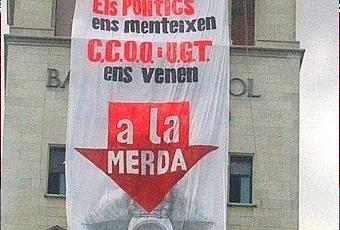 Gran pancarta colocada en Barcelona, en la fachada del antiguo edificio de Banesto, en la Plaza de Cataluña; “La Banca nos asfixia, la Patronal nos explota, Los Políticos nos mienten, CCOO y UGT nos venden, A LA MIERDA “.