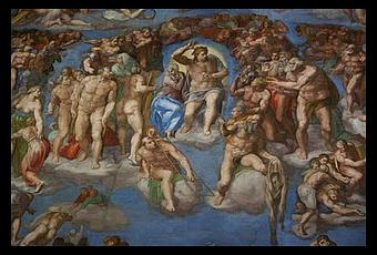 En la imagen, el Juicio Final, de Miguel Ángel, en la Capilla Sixtina. Obsérvense los taparrabos pintados por Volterra sobre los cuerpos originales, que se han mantenido tras la reciente restauración de los frescos.