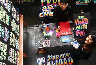En Barranca, cuando cursaba el sexto de primera gané un concurso de dibujo. Entonces, todo mi colegio y mis papás se enteraron de que era bueno para algo. Durante toda mi secundaria me preocupé por mi aprendizaje en el dibujo y la pintura. Cuando me vine a estudiar para acá, nadie sabía que estaba postulando para Bellas Artes, todo el mundo creía que iba a ser arquitecto o ingeniero. Cuando trabajábamos vendiendo en la feria de Barranco, nos dimos cuenta que cuando la gente nos veía pintando los letreros en vivo, el interés era mayor por aprender la técnica. Para entonces ya estába- mos viendo la posibilidad de alquilar nuestro propio taller. Esto siempre fue un sueño. Ya llevábamos como dos años de feria en feria y la competencia también estaba creciendo. Y así es como nos decidimos por este local en Chorrillos. Empezamos a dictar clases aquí desde el 2014 y gracias a los talleres nos fue mucho mejor económicamente. Más que por las exposiciones, nos hemos hecho conocidos gracias a los talleres que dictamos y gracias a los cuales hemos tenido la oportunidad de viajar a diferentes partes del mundo.