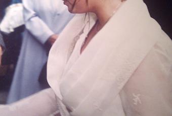 Un vestido de la firma francesa Cymbeline que me enamoró en cuanto me lo probé y que no tenía nada que ver con la idea que yo llevaba en mi cabeza cuando acudí al atelier.Yo quería llevar manga, me casaba a finales de octubre y en Santander en esas fechas lo normal es tener un tiempo plenamente otoñal, así que mi idea original consistía en un vestido clásico y liso con un abrigo de encaje encima del estilo del de la imagen.
