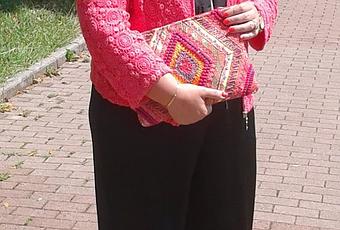 Esta vez combino el mono negro con una chaqueta de guipur en color coral. Las sandalias y el bolso coordinan con el color de la chaqueta.Espero que os guste.