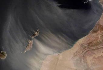 Fotografía de la NASA de una calima de polvo del Sahara cubriendo las Islas Canarias, capturada por satélite.