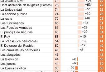 Mientras que los partidos políticos, entre cuyas filas no escasean los corruptos e incompetentes, son los que salen peor valorados... Una muy baja puntuación obtendrían también nuestros bancos, los obispos, la patronal, los sindicatos, e instituciones del peso y la importancia del Parlamento o el Gobierno del Estado... ¿¿!!