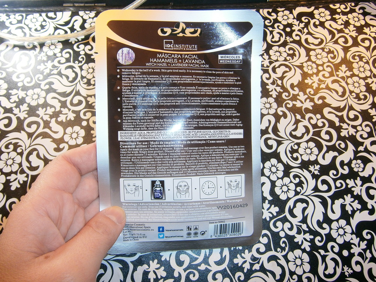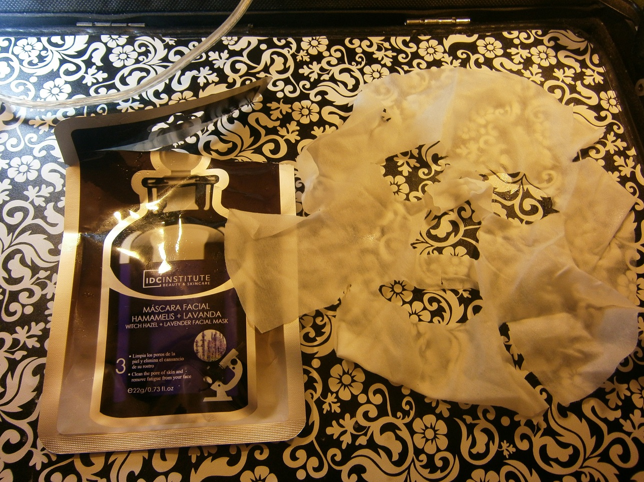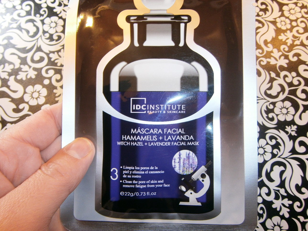 -Máscarilla facial de IDC Institute. Es una mascarilla tipo "careta de algodón" impregnada en producto, en esta caso de Hamamelis + Lavanda, dedicada para limpiar los poros de la de la piel y eliminar el cansancio del rostro.