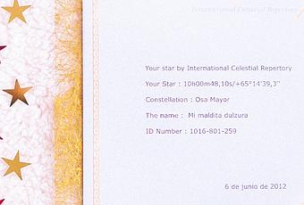 ¡Ha nacido una estrella y se llama Mi maldita dulzura! Sí, como lees, y es todo gracias a Etoilez-Moi, una empresa francesa que se dedica a bautizar estrellas con el nombre y la fecha que nosotros deseemos, además de elegir también la constelación para que así pueda estar lo más personalizada posible. Lo realizan a través del International Celestial Repertory, registro oficial de identificación de estrellas, por lo que te garantizan que esa estrella es única (sólo tuya). Creo que es un regalo súper especial y original (en su web tienen un montón de packs para cumpleaños, bautizos, San Valentín...), perfecto para estas Navidades porque ¿a quién no le gustaría brillar en el universo a través de una estrella? A mí me han enviado el pack 'Estrella fugaz' en su versión económica y recibí directamente los documentos al email: el certificado de registro, el mapa celeste, la ficha de la constelación y un precioso poema. ¿Sencillo y cómodo, verdad? ¡Pues anímate y regálasela a tu persona más especial!