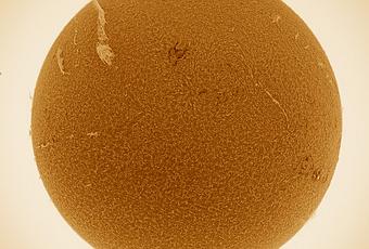En esta vista telescópica del 27 de abril, un largo filamento solar se estira por la superficie relativamente calmada del Sol. La imagen de banda estrecha en negativo o invertida se captó con la luz de los átomos de hidrógeno ionizado. En la parte superior izquierda se ve una magnífica cortina de plasma magnetizado que se levanta sobre la superficie; en realidad llega más allá del borde del Sol. ¿Como es de largo este filamento solar? Pues más o menos la misma distancia que hay de la Tierra a la Luna, lo que se ilustra a la izquierda. Moviéndose hacia la derecha por el disco solar, al día siguiente el largo filamento entró en erupción y emergió de la superficie solar. Supervisada por los satélites que vigilan el Sol, en el mismo lugar también estalló una eyección de masa coronal, pero se espera que pase mucho allá del planeta.
