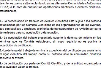 Tamén fixemos propostas para "acabar coa perversión do incentivo". na que sinalamos que "Ninguén se atreve a definir nin de lonxe criterios de calidade destas actividades" porque hai un estímulo perverso que pecha o circulo: A relación entre comunicacions/pósteres aceptados e inscripcións ós congresos. Por iso propuñamos unha doble certificación para os eventos; unha para os asistentes que se concede a priori (a actual "interés científico sanitario") e outra para as comunicacions/pósteres a posteriori "Evento baremable SNS" que xulga o sistema de avaliación científica de cada evento.