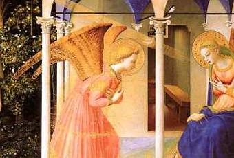 No hay nada de terrible en los ángeles dulces y temblorosos de Fra Angélico. En realidad, salvo por sus vestiduras y sus alas, sus rostros y actitudes son semejantes a las nuestras. Es verdad que desprenden luz, pero ¿no pasa eso mismo con todos los personajes de sus cuadros? En La Anunciación una paloma atraviesa, siguiendo la estela de un rayo de oro, el jardín del Edén hasta alcanzar el rostro y el pecho de María, que adopta una actitud de absorta entrega. Pero la luz de este cuadro no solo viene de ese rayo divino. Un tenue haz de luz dorada entra por la ventana del fondo y el propio ángel resplandece. En realidad está en cada cosa, como si la luz fuera la cualidad más íntima de todo cuanto existe, no solo de los seres vivos sino también de los objetos y las plantas.