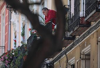 Un hombre se asoma a su balcón en Madrid. Foto de Kike Para¿Cómo seremos después de la pandemia?, se pregunta en el A vuelapluma de hoy [Enmienda. El País, 18/4/2020] el filósofo Fernando Savater: Ojalá hayamos aprendido a quejarnos menos y disfrutar más, afirma.