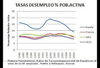 Durante los años ochenta las tasas de paro en España eran sistemáticamente más altas que las del resto de Europa, manteniéndose durante muchos años cercanas al doble que en los países de la UE. En todo caso conviene prestar mayor atención a las cifras de activos ocupados que a las de parados, ya que muchas veces tapan parte de la realidad de la gente que trabaja –se entiende dentro del mercado laboral oficial-. Los ocupados han aumentado desde 1996/97 hasta 2008 aumentando la tasa de actividad, y fundamentalmente por la importancia de la incorporación de mujeres al mercado de trabajo.