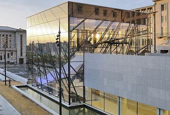 Su estructura en forma de árbol y una estética basada en la transparencia y la luz, evoca irresistiblemente la arquitectura paisajística, se arraiga en la historia y proyecta el "Mont des Arts" en la modernidad. Esta monumentalidad, suave y poética, dialoga con la imagen del jardín. Presente y al mismo tiempo fundiéndose con el paisaje arquitectónico circundante, cambia de materialidad al cambiar la luz y la hora del día. La entrada, en forma de un gran auditorio exterior, permite acceder a la base del cubo, deslizándose a lo largo de la sala de exposiciones bajo el jardín histórico renovado de René Pechère. Una terraza conduce al acceso superior situado en la " Esplanade du Mont des Arts "