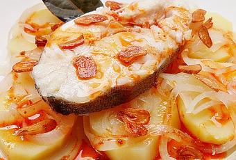 - A la hora de servir el plato, colocaremos una cama de patata en la base del mismo. Luego otra con la cebolla en aros, y el pescado encima.