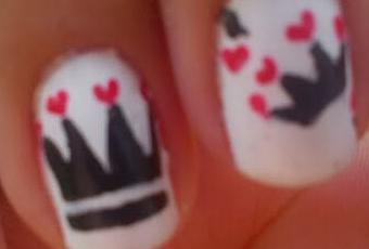 Sobre una base blanca dibuje con acrílicos corazones y coronas para representar a la reina de corazones, en el dedo indice y medio dibuje unas cartas representando un as de corazones.Y bien esto ha sido todo por hoy, nos leemos pronto.