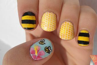 El diseño de la manicura gira todo en torno a las abejas, su panal, las flores de las que recogen el polen para la miel...