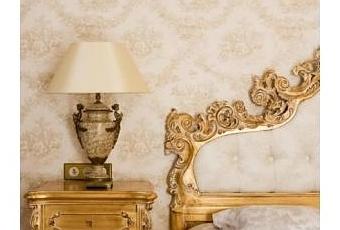 En un rincón, estratégicamente situada vemos una lámpara de mesa con base de porcelana en blanco roto y una exquisita decoración en oro, con pantalla a juego. En consonancia con ella, en otro de los rincones se colocó una lámpara de pie con soporte dorado muy estilizado y sutil, que se funde en las tonalidades del ambiente.