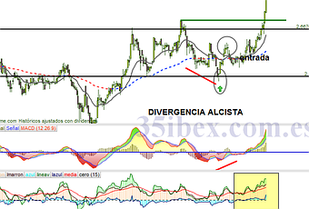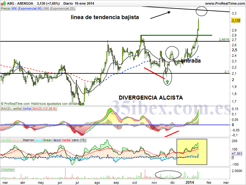 Probablemente veas en el gráfico que he puesto “entrada”, es donde en teoría y según mi sistema de trading CAB (Comprar Acciones De Bolsa) Abengoa dio entraday se debería haber comprado. Por eso la llevo tiempo vigilando desde hace un tiempo.La mano fuerte ya no tiene complejos y sigue acumulando, el MACD semanal cortado al alza, como he dicho en otras ocasiones proporcionando “momentum” alcista y que decir del diario…subiendo, subiendo, subiendo, tanto en sus líneas como en el histograma.Esto no ha hecho más que empezar y el objetivo que he marcado en otras ocasiones para Abengoa, la zona 4.46 no sería desdeñable, incluso puede que a final de año la veamos cotizando por encima de esa zona…con paciencia.http://feeds.feedburner.com/blogspot/dADkpn