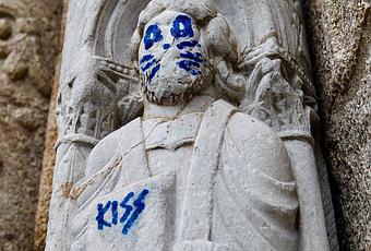 Amanecemos con el tortazo de una pintada en una escultura del siglo XII de la Catedral de Santiago. Aberrante porque berra a la inteligencia. El impresentable que hizo semejante burrada le dedicó un tiempo a pintar bien la grafía de un conocido grupo de hard rock. Que lo detengan y le espeten en la cara su infamia, su hard kiss, su escupitajo al Patrimonio mundial. Menuda imagen de país bananero, que no respeta ni su propia Cultura. Ojalá alguna cámara de seguridad nos pinte pronto el rostro del vándalo, o vándalos, porque se va a enterar de que los besos duros, los hard kisses, duelen de verdad y no los olvidas jamás.