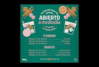 En este ciclo de horario matinal, el EDP Gran Vía nos presenta un ciclo con seis directos; estos directos son los de MClan, Marlango, Manel, Juanito Makandé, Arnau Griso y Tu Otra Bonita; un ciclo llamado Abierto a Mediodía; un ciclo lleno de seguridad con el que disfrutar de buenos shows en horario de mañana.