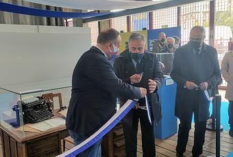 El presidente de la SD Ponferradina, José Fdez Nieto, acompañado de la diputada de cultura de la Diputación de León, el Alcalde de Ponferrada y el Presidente del Consejo Comarcal, han inaugurado esta mañana la exposición que celebra el Centenario del club en el Museo del Ferrocarril de Ponferrada.