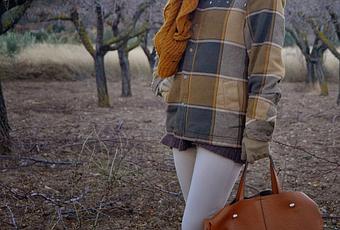 Lo he combinado con borsalino marrón, maxibufanda color mostaza, maxi-sueter marrón de cuello chimenea, leggins beige y botines marrones. Maxibolso marrón y guantes de algodón. Os dejo con las fotos: