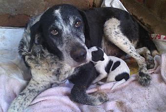 Todos los años pare dos veces, un hombre que vive por allí le quita los cachorros y los tira al río, esta última vez ha parido cinco encima de basura y estiércol le han dejado uno o quizás estaba escondido y no lo vio. Esta muy gordito ya, pero pronto saldrá andando y correrá peligro.