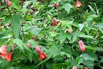 Como ocurre en la mayoría de las plantas de la familia de las Malváceas, hibisco, malva real, lavatera, el abutilón es muy apreciado por la belleza de sus flores y hojas. Nativo del Brasil, este arbusto, de ramas abiertas y hojas grandes de color verde mate, produce flores colgantes de tonos rojo y amarillo, que se tornan anaranjadas al final del verano y en otoño. La floración de sus variedades difiere no sólo en el mayor tamaño, sino en la coloración, pudiendo encontrarse abutilones con las flores por completo rojas o de pétalos anaranjados con nervios rojos. Crece hasta alcanzar una altura de dos metros en ejemplares de más desarrollo, aunque es normal que su talla se sitúe entre el metro y medio y los dos. Sus hojas, acorazonadas y de un color verde oscuro mate, tienen buen tamaño y son claramente asimétricas, con unos pequeños lóbulos que se marcan visiblemente en su limbo; esto hace que recuerden a las de los arces, por lo que recibe el sobrenombre de arce tropical. En el caso de la especie tipo, estas hojas son de menor tamaño y de forma lanceolada, sin presentar atisbos de lóbulos. La variedad cultivada conocida como "Variegatum" posee hermosas hojas salpicadas de amarillo, seguramente a causa de un virus.