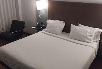 A la derecha encontramos la cama. Generosa. Sobre un pequeño canapé gris se levanta un confortable colchón de enorme calibre vestido con un suave nórdico blanco. Cuatro cómodas almohadas en blanco con una tira gris en un extremo. Todo ello apoyado sobre un cabecero en tela marrón. A cada lado, hay dos bandas metálicas que sostienen unas repisas de metacrilato negro que hacen las veces de mesilla. En una de ellas un moderno teléfono, una botella de agua de cortesía, un bloc de notas y un bolígrafo. En la otra, varios folletos del hotel y el mando a distancia de la tele. Debajo, un enchufe disponible. Encima dos apliques de luz en metal con tulipa blanca y dos focos reflectores de luz intensa para el trabajo en la cama. Los interruptores, en negro sólo permiten dos opciones de luz: todo encendido o todo apagado, a excepción del foco reflector de lectura. Quizá podría conseguirse un mejor juego lumínico, pero el resultado no es del todo malo.La pared restante la ocupa el armario de puertas correderas. A derecha e izquierda sendos espejos de cuerpo entero. En el centro, protegido por unas puertas de madera y metacrilato blanco que deja pasar la luz del interior encontramos el armario con una larga barra colgadora con media docena de perchas normales de madera con el logo de la cadena. Una balda larga y una repisa en la que se ofrece la bolsa de la lavandería.