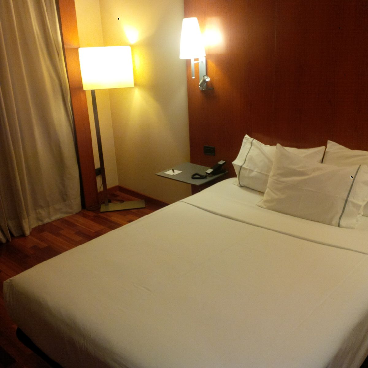 La cama es blanca. Pequeña para ser doble aunque generosa para ser individual. Vestida con una sábana blanca y nada más. Tres almohadas de distinta dureza. Demasiado trabajada. El colchón se comba hacia el medio de la cama, y algunos muelles molestan. Se hace incómodo el dormir, amén del terrible ruido que viene de la extracción de aire. Está empotrada en un cabecero de la misma madera que el resto de la habitación. De él salen sendas mesillas en tono metálico con demasiadas marcas de cigarrillos. A ambos lados hay interruptores de la luz. Y en uno de ellos, un enchufe. Sobre una mesilla un teléfono, un bloc de notas y un bolígrafo. Sobre la otra el mando de la televisión. Encima de las mesillas, sendas lámparas de noche con pantalla estrella y larga y dos potentes focos de lectura. Las luces permiten crear un mínimo juego efectista en la habitación y podemos encender sólo algunas.