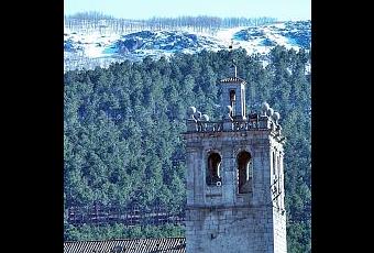 Torre de la iglesia de Navamorcuende con la sierra nevada al fondoEL PALACIO Y LA IGLESIA