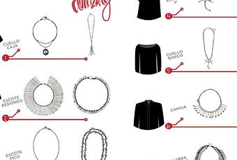 Por ejemplo, para las camisetas básicas de un solo color , los collares largos son la mejor opción.Un collar ovalado quedaría muy bien con un escote de pico. Con una camiseta de estampados muy llamativos, es mejor prescindir de los collares y apostar por otros complementos.