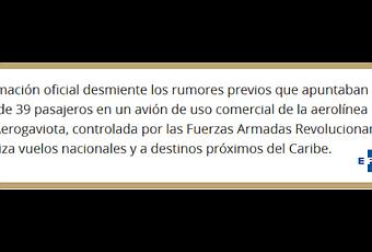 La información oficial desmiente los rumores previos que apuntaban a la muerte de 39 pasajeros en un avión de uso comercial de la aerolínea estatal Aerogaviota, controlada por las Fuerzas Armadas Revolucionarias, que realiza vuelos nacionales y a destinos próximos del Caribe. Efe