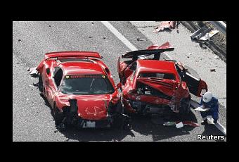 En una concentración de coches de lujo en Japón, Ocho Ferraris, tres Mercedes-Benz, un Lamborghini y otros dos vehículos se vieron envueltos en un costoso accidente. En valor total de los coches de lujo se calculan que puede estar en torno a 300 millones de yenes (US$3.85 millones), según las autoridades.