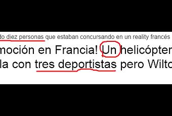 Se empeña el redactor en meter a Sylvain Wiltord en el titular, pero en realidad el exfutbolista no tiene por qué estar ahí, ya que no viajaba en ninguno de los dos helicópteros siniestrados -la fortuna había llamado a su puerta en forma de eliminación del reality-. La lectura da a entender que Wiltord iba a bordo de un aparato y sobrevivió al accidente. Un titular ha de aportar información, no confusión. Y en esto último, el de la noticia en cuestión se lleva la palma.