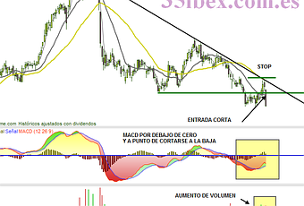Cuando el precio rompe por debajo de la media de 18 sesiones, automáticamente la entrada corta está servida. Stop según el sistema por encima de la media de 40 sesiones.