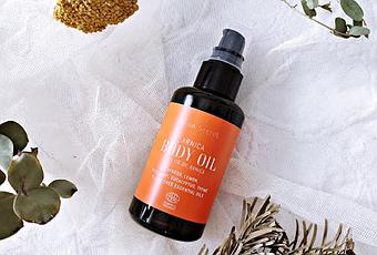 La gama se compone de seis aceites corporales concentrados y efectivos: Aceite de Rosa de Mosqueta, Aceite de varices y piernas cansadas, Aceite relajante, Aceite de articulaciones, el Aceite Firming Yozu, del que os hablé aquí, y el Aceite de árnica, que estoy probando y del cual os voy a hablar hoy.